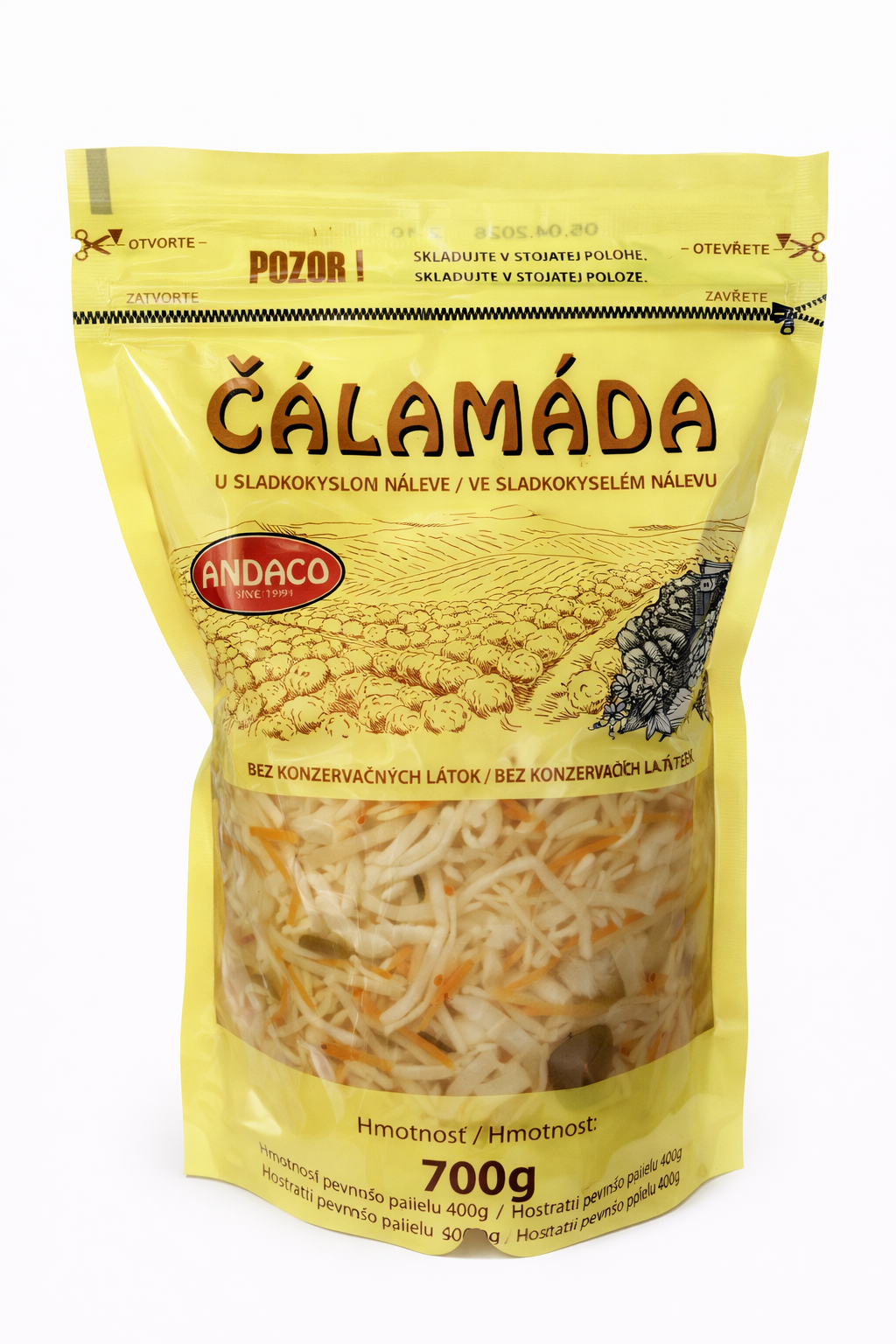 Zlenina v rôznych pomeroch (kapusta hlávková biela, cibuľa, mrkva, paprika, uhorka), nálev(pitná voda, jablčný ocot,cukror, jedlá soľ, zmes korenín)